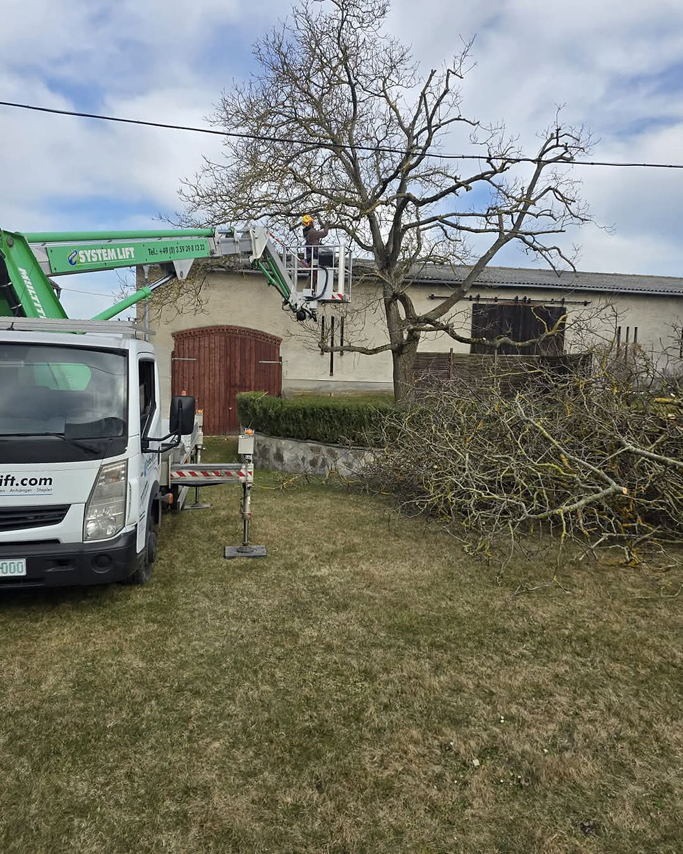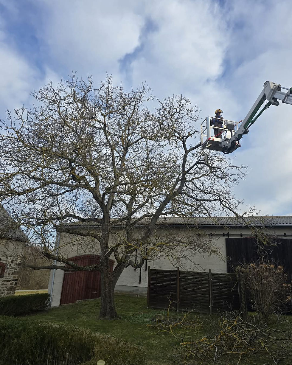 Unser Auftrag lautete: Fachgerechter Rückschnitt eines großen Nussbaums in Ottenheim unter Einsatz einer Hebebühne.